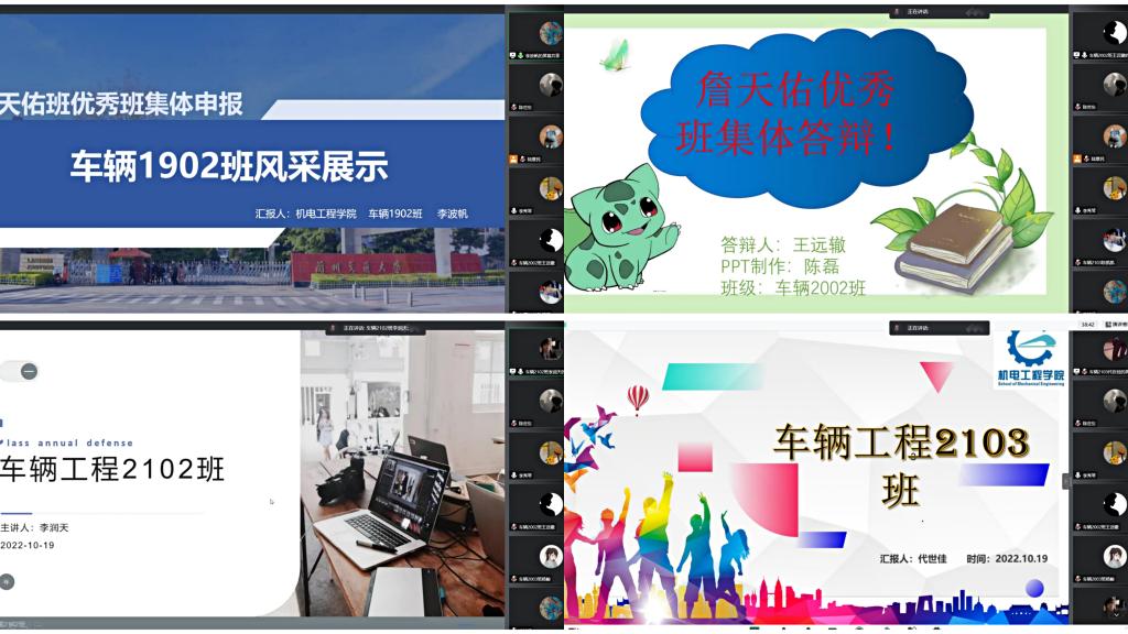 此次詹天佑班共有5个班级申报优秀班集体,5名学生申报优秀学生。学院按照评审条件对班级和个人提交的申报材料初步审核,所有递交申请的集体与个人均符合评审条件并参加了答辩评选。优秀班集体答辩环节,由各班选派代表进行了答辩,班级以PPT形式呈现,从班级基本情况介绍、班风学风建设活动、创新科研竞赛、班级荣誉等方面进行了阐述,各班从多方面多角度展示出活力四射,团结友爱,积极进取的精神面貌;优秀学生评选环节,由参选的学生进行个人陈述,同学们从思想作风、学业成绩、个人荣誉、社会实践、学科竞赛等方面进行陈述,充分展现了我院詹班学子素质全面、积极进取、能力突出、志存高远的精神品质。此次评选,评审老师坚持公平、公正、公开的原则严格按照《詹天佑班管理办法》规定的评优评审条件进行评定。