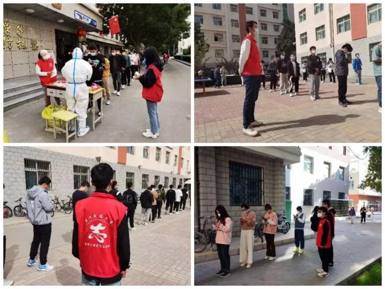 助力核酸检测工作。10月11日,在学校组织开展的全员核酸检测工作中,我院50名学生志愿者参与核酸检测工作,在北校区的宿舍楼下,身穿红衣的志愿者们一丝不苟的维持着现场秩序,疏导人群,时刻提醒同学们保持安全距离。在学生志愿者和学生干部的合理调配下,短短两小时内 ,北校区全体同学高效配合医护人员完成了核酸检测工作,核酸检测工作结束后,志愿者们向所有辛苦付出的医护工作者致谢。
