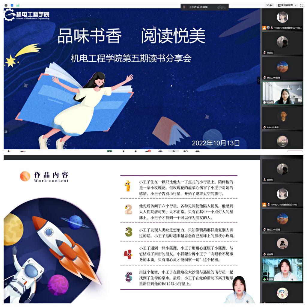 为了进一步营造“爱读书、善读书、读好书”的浓厚学习氛围,努力构建“书香学院、书香班级、书香宿舍”格局,深入推进学院学风建设,引领学生全面发展,2022年10月13日下午2:30,机电工程学院举行了“品味书香,阅读悦美”为主题的第五期线上读书分享会,学院党委副书记、副院长荀新文,学工办主任张晓丽以及2022级300余名新生参加了此次会议,本期读书分享会由乔瑞瑶同学主持。