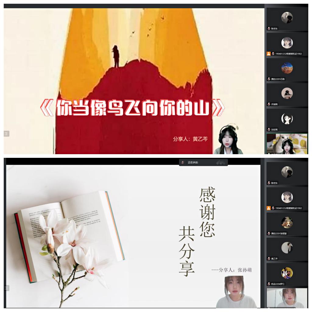 两位分享同学依次与大家分享了自己的读书经历和阅读体验,刘佳瑶同学分享了《小王子》,这本书告诉我们,每个人都是一颗独特的星球,他帮我们找回丢失的纯真、童年,小王子代表了真正的你我,一个褪去角色、姓名、身份的自我,这个童话是在帮我们寻找自我存在的价值;黄乙芩同学分享了《你当像鸟飞往你的山》一书,不管我们在什么样的家庭环境成长,自我教育是永远不可缺少的,如果我们自己不去寻找正确的答案,那可能永远不知道什么才是正确的,我们都应该在混沌的世界里去定义出那个核心的自我,然后,不要害怕挣扎,去拥抱那个自我。