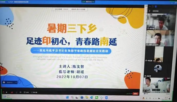 机电工程学院2022年“青春献礼二十大·践履笃行映初心”暑期社会实践成果宣讲会以“QQ群直播+腾讯会议转播”相结合的方式线上举行,“传承红色薪火,焕发时代光芒”暑假社会实践团、“共育‘石榴籽’浇灌民族花”暑假社会实践团、“自贸海南乘风起,青春百年破浪行”重走习近平总书记在海南考察路线实践团面向学院全体大一新生、团学干部共计950余人开展宣讲,以传承延安精神、弘扬民族团结精神、感悟祖国发展变化为宣讲主线,以PPT、图片、视频相结合的方式依次展示了他们丰富多彩的实践过程,叙述他们行路于广袤大地,思悟于实践之途的点点滴滴,以他们务实的作风、扎实的实践过程、优异的实践成果感召学院更多的青年学子汲取奋进力量,以实践增长才干,以行动书写青春。