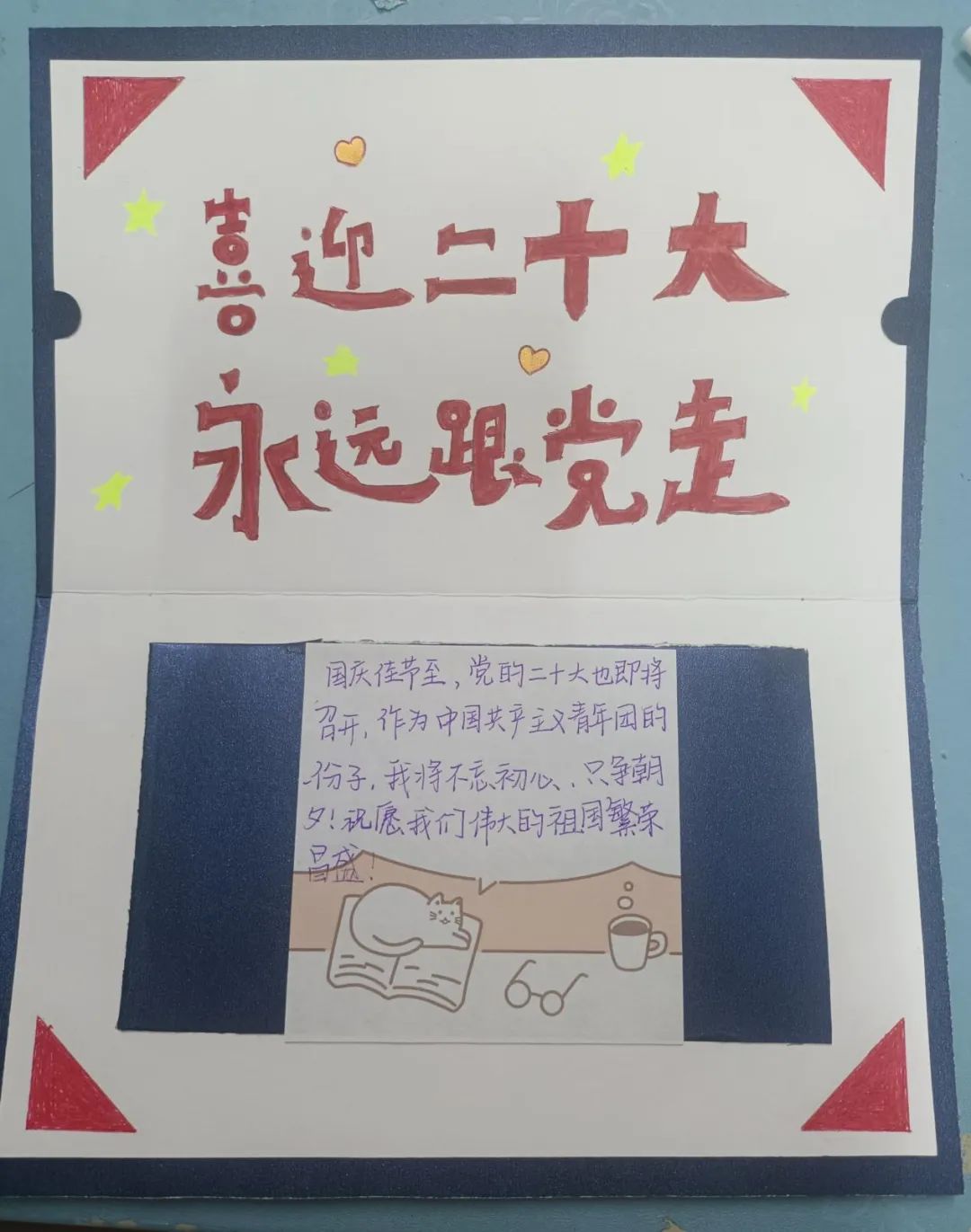 喜迎二十大,永远跟党走,奋进新征程。此次活动的开展引导广大青年厚植爱党、爱国、爱社会主义的情感,进一步坚定理想信念,不忘初心,砥砺前行,同时丰富了校园文化生活,营造了校园喜迎二十大的和谐氛围。
