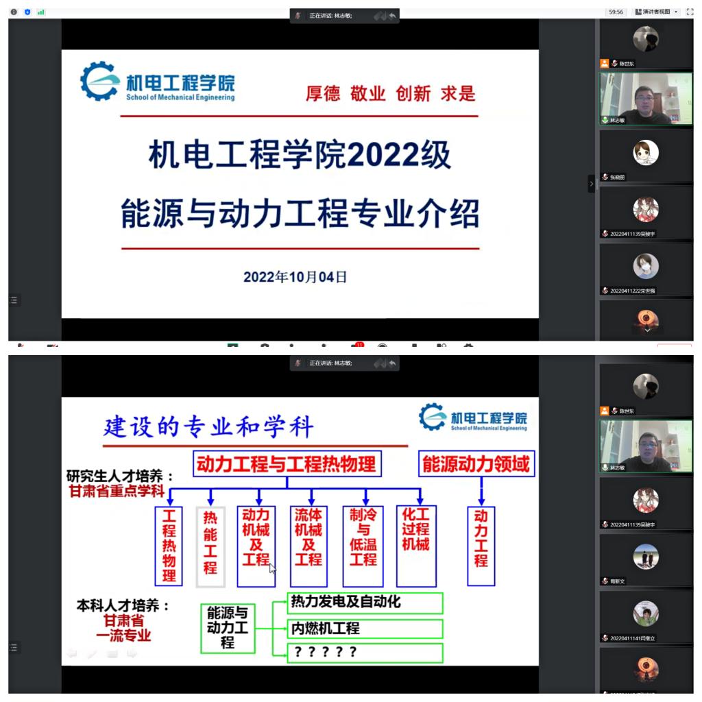 新生入学教育是高校思想政治教育的重要组成部分,入学教育的好坏,直接关系到学生在大学期间的成长。开展新生入学教育是加强和改进大学生教育工作的有效途径,目的是让学生了解所学专业的基本情况与学习方法,培养自主学习的能力与习惯,以适应大学的学习生活,使学生从思想上和心理上完成从高中到大学的转变。机电工程学院高度重视新生入学教育,加强顶层设计,制订了《机电工程学院2022级新生入学教育方案》,内容涵盖了校史校情和院史院情教育、校纪校规教育、学习教育和专项教育,10月4日晚7:30,能源与动力工程系主任林志敏面向能源与动力工程专业新生进行了线上专业思想教育宣讲,学院党委副书记副院长荀新文、能源与动力工程专业全体新生聆听了讲座。讲座由学生工作办公室主任张晓丽主持。