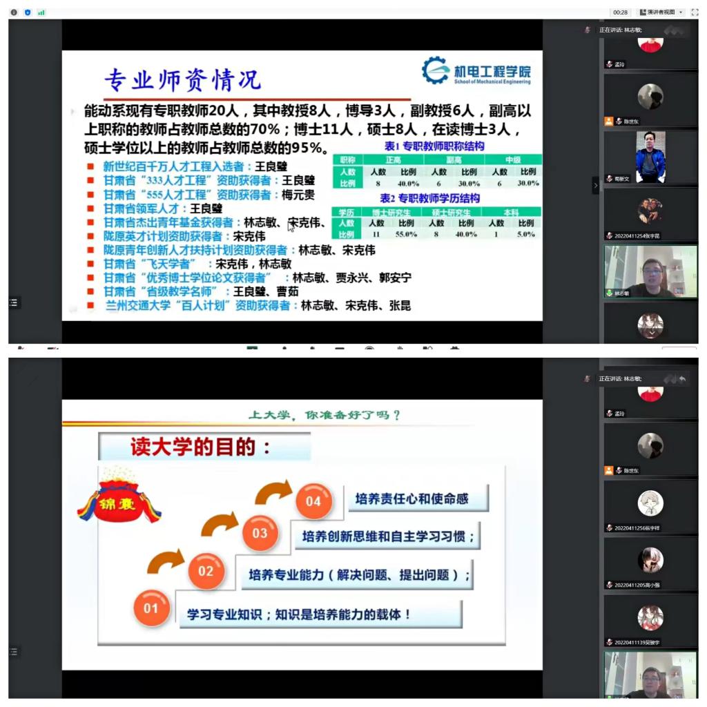 系主任林志敏简单介绍了学校办学情况、校史校情、人才培养、师资力量、招生就业情况、知名校友、培养平台等;详细介绍了学院基本情况、历史沿革、学科发展、专业建设、课程设置、师资力量、学生工作、实践平台、科学研究平台及成果、学院发展目标、问题和措施等;重点介绍了能源与动力工程专业发展和地位、学科发展历程、科研工作、获奖情况、课程体系结构、教学工作、实践实训平台、培养目标与定位、培养方向、毕业要求等,并根据教学经验和部分用人单位要求,指明了考研和就业方向。系主任林志敏专题讨论了“上大学,你准备好了吗?”,向新生同学们分析了大学的五大使命、读大学的目的、老师三问、读好大学的标准、如何读好大学、大学与中学的区别及角色转化,为新生同学们的大学学习和生活给出了宝贵的建议,深情寄语新生同学们树立明确目标,合理规划时间,学好专业知识;找准自身定位,考取相关证书,熟练使用专业相关软件;参与学科竞赛,提升实践能力,锤炼过硬本领;鼓励新生同学们志存高远、脚踏实地,以饱满的热情、积极的心态融入到崭新的大学新生活中,成长为服务铁路行业及地方经济建设和科技发展的高级工程技术人才。