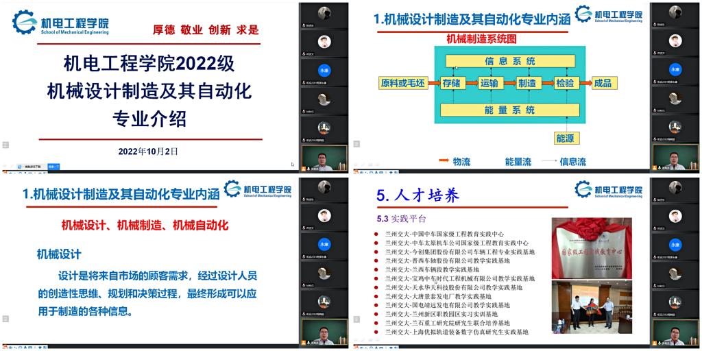 为帮助2022级新生认识专业特点和发展方向,加强新生成长规划教育,指导新生更好更快适应大学生活,机电工程学院举办了新生专业教育专题讲座,10月2日下午3:30,机械设计制造及其自动化专业系主任张艳龙面向机械设计制造及其自动化专业新生进行了线上宣讲,机械设计制造及其自动化专业全体新生聆听了讲座,讲座由学院学生工作办公室主任张晓丽主持。