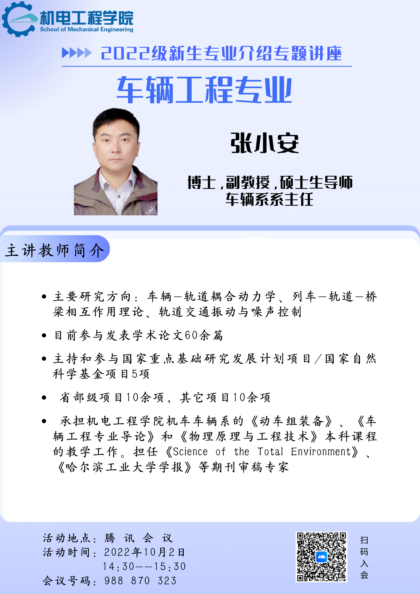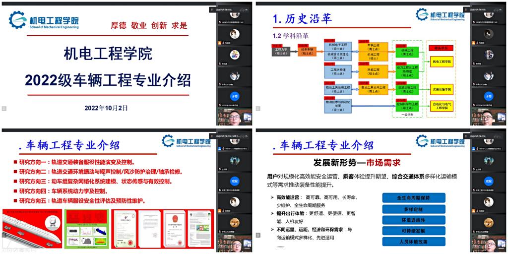 为加强2022级新生的专业认知,更好地规划学习目标,适应大学学习生活,机电工程学院举办了新生专业教育专题讲座,10月2日下午2:30,车辆工程专业系主任张小安面向车辆工程专业新生分两场次进行了线上宣讲,车辆工程专业全体新生聆听了讲座,讲座由学院学生工作办公室主任张晓丽主持。