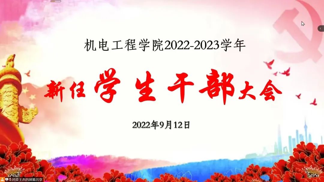 2022年9月12日下午4:00,机电工程学院以线上腾讯会议形式召开新任学生干部大会。机电工程学院党委副书记、副院长荀新文,学院第十四届团委、学生会、青年志愿者协会主席团成员以及新任的学生会主席团成员、团委、青年志愿者协会学生干部参加了会议,会议由团委书记胡瑶主持。