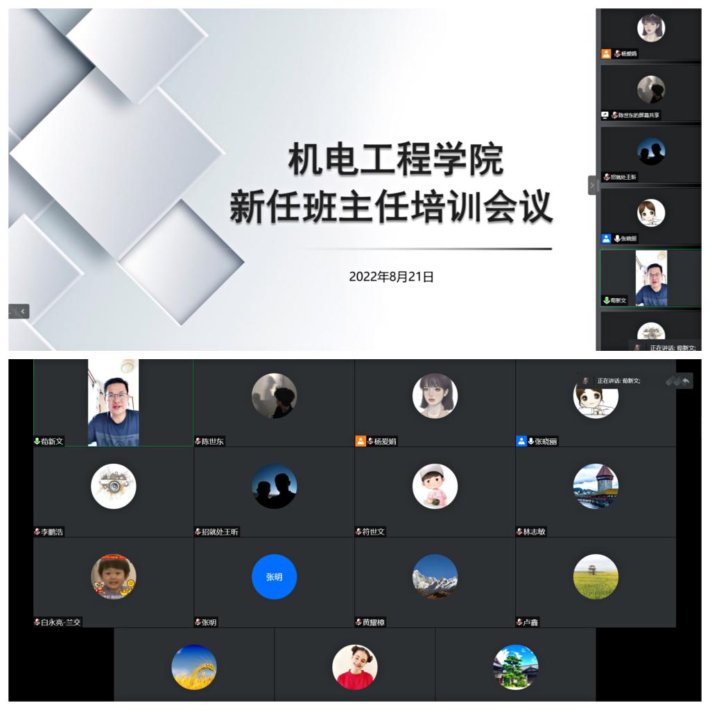 班主任是高校大学生开展德育工作和思想政治教育工作的主体力量,为加强新任班主任队伍建设,切实提升新任班主任的专业素养和管理水平,保障学院学生管理工作平稳推进,8月21日上午11:00,机电工程学院通过腾讯会议召开了新任班主任培训会,学生工作办公室主任张晓丽、全体新任班主任参加了此次会议,会议由学院党委副书记、副院长荀新文主持。