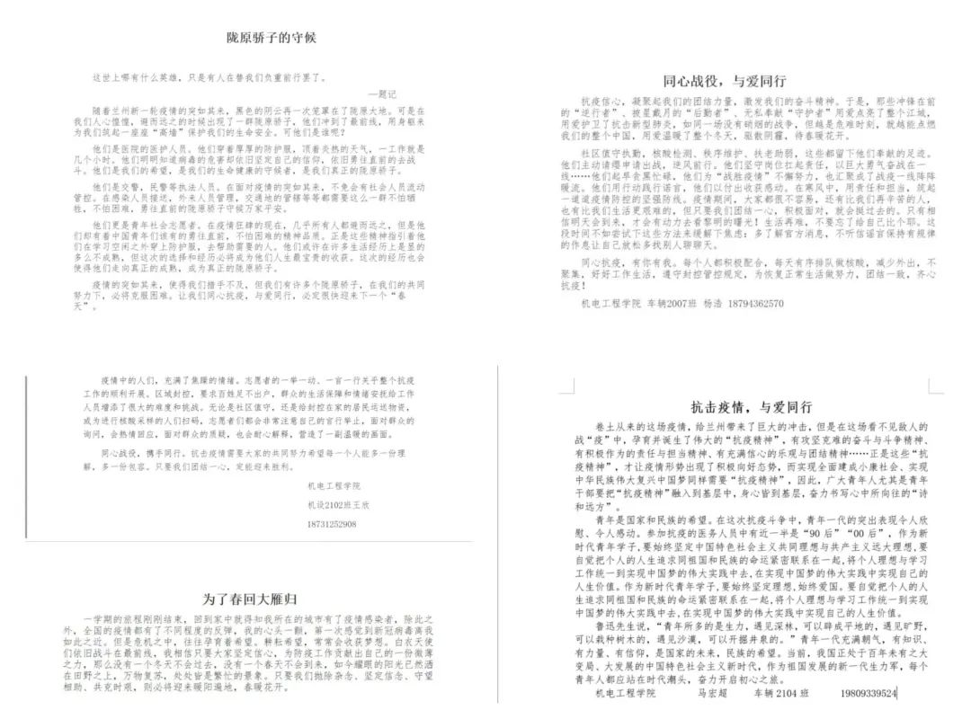 为传递心声、鼓舞士气,兰州交通大学机电工程学院特此举办“同心战疫,与爱同行”主题征文线上征集活动,向全校师生传递爱与守望互助,传递我们战疫必胜的决心。自学院启动主题征文活动以来,全院学生上下反响热烈、踊跃参与,先后征集作品百余份。机电学子以文字深情讲述自己的抗疫心路、深刻感悟、动人故事,一篇篇文章感人肺腑,催人奋进!