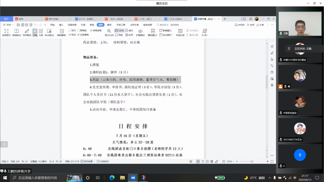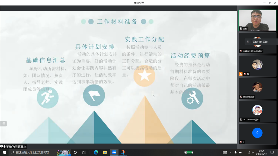 此外,学院青年志愿者协会负责人王鹏学长、刘玉海学长向大家分享了他们的2021年“三下乡”暑期社会实践经验。王鹏学长以2021年“三下乡”暑期社会实践项目——“党史铭记我心,青春筑梦前行”为例,分申报注意事项、相关材料撰写及提交说明、媒体宣传和实践成果设计进行分享,并对各团队应急预案准备进行了提醒;刘玉海学长对媒体宣传和成果设计方面作了简短的介绍,希望各个团队在做好安全防护的前提下明确实践主题,采用多种实践方式,有计划有组织地开展活动。