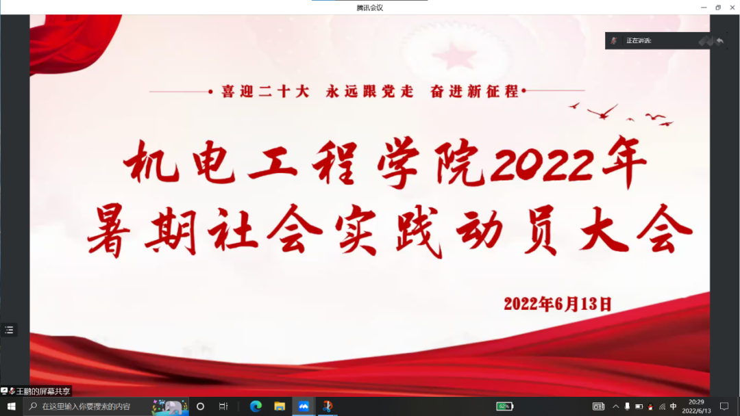 为深入学习贯彻习近平新时代中国特色社会主义思想,学习宣传贯彻党的十九届六中全会精神,认真落实习近平总书记关于青年工作的重要思想,鼓励引导学生积极投身社会实践,在社会课堂中“受教育、长才干、作贡献”,引导大学生充分感受家乡变化,铭记党的奋斗历程,增强服务人民、回报家乡的责任感与使命感。6月14日19:30,机电工程学院团委线上召开了2022年暑期社会实践动员大会,学院团委书记胡瑶、学生干部代表、学院各级团支部书记共100余人参加了会议。