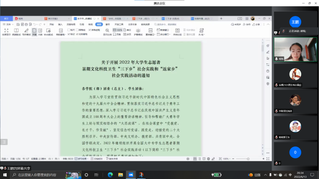 会上,学院团委书记胡瑶老师详细解读了校团委《关于开展2022年大学生志愿者暑期文化科技卫生“三下乡”社会实践和“返家乡”社会实践的通知》(以下简称《通知》),从活动主题、总体原则、重点团队、专项活动、“返家乡”社会实践活动等八个方面进行了详细说明,从前期动员、申报流程、实践活动、宣传总结及后期成果展示四个阶段出发,结合自身经验介绍了如何做好暑期社会实践。她强调个人安全问题是暑期社会实践的关键,在实践期间各团队务必做好安全报备工作,严格遵守疫情防控要求,她指出,组队暑期实践要有明确的分工,取长补短,还必须注重小组实践成果的应用和转化,积极向校内外媒体投稿,这既是对实践成果的一种展示,也可以扩大学院暑期社会实践活动的宣传范围。