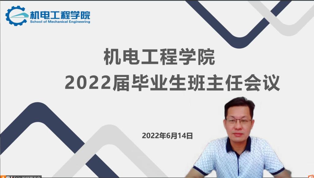 为切实做好疫情防控形势下的毕业生教育管理,确保毕业生安全文明顺利离校,切实维护校园安全稳定,6月14日下午5:00,机电工程学院通过腾讯会议召开了2022届毕业生全体班主任会议,学生工作办公室主任张晓丽、2022届全体班主任参加了此次会议,会议由学院党委副书记、副院长荀新文主持。会后各班陆续组织召开了“毕业生最后一课”主题班会。