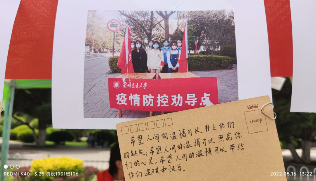 早上8点,志愿者们就开始在图书馆门前挂横幅、搭帐篷、粘海报,有序的做好活动的前期准备工作。明媚的阳光下,志愿者们分工明确,有的拿着宣传海报,向周围的路人宣传我们的活动;有的站在帐篷旁边,有序的组织参与人员进行游戏;有的组织参与人员进行答题;还有的同学们与参与人员一起为兰州助残基地的孩子们写信送温暖,暖心的话,充满爱的画,彰显了同学们扶残助残的爱心,一份份充满爱的明信片也会在活动结束后送往残障人士基地,让残障人士感受到来自同学们的关爱。活动接近尾声,志愿者们合影留念。