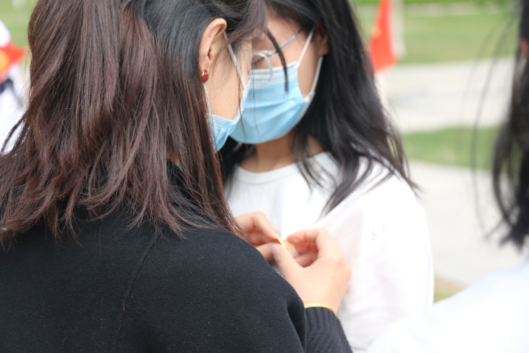 学院团委书记胡瑶老师和团学干部为新团员颁发团徽、团员证,并亲切地为他们佩戴团徽。当墨绿色的团员证捧在手中,当闪耀的团徽别在胸前,这不仅仅是一份沉淀淀的责任,更是一份当代优秀青年永远跟党走的信念与决心。