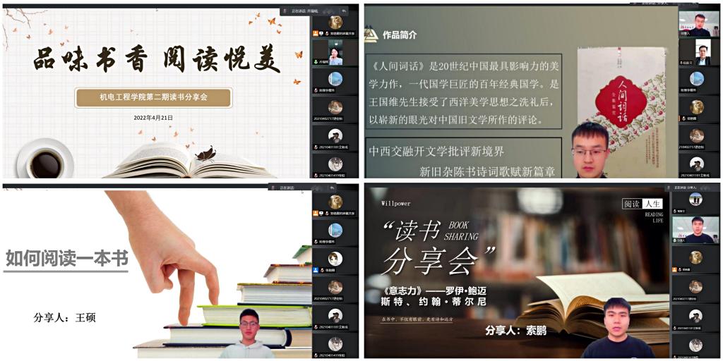 为了进一步营造“爱读书、善读书、读好书”的浓厚学习氛围,努力构建“书香学院、书香班级、书香宿舍”格局,深入推进学院学风建设,引领学生全面发展,4月21日下午,机电工程学院举行了“品味书香,阅读悦美”为主题的第二期线上读书分享会,学院党委副书记、副院长荀新文,学工办主任张晓丽,辅导员和2021级300余名学生参加了会议,本期读书分享会由机械电子2002班乔瑞瑶同学主持。