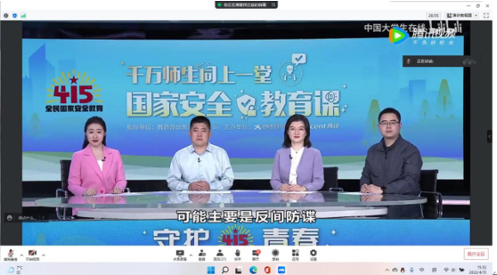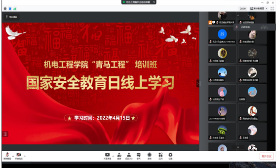 4月15日是全民国家安全教育日,今年的全民国家安全教育日的主题是“树牢总体国家安全观,感悟新时代国家安全成就,为迎接党的二十大胜利召开营造良好氛围”。为进一步推动总体国家安全观深入人心、落地生根,引导同学们进一步增强安全意识和法治观念,自觉守法护法,4月15日15:30,机电工程学院组织院级“青马工程”学员开展国家安全线上学习活动,通过腾讯会议共同观看“千万师生同上一堂国家安全教育课”。