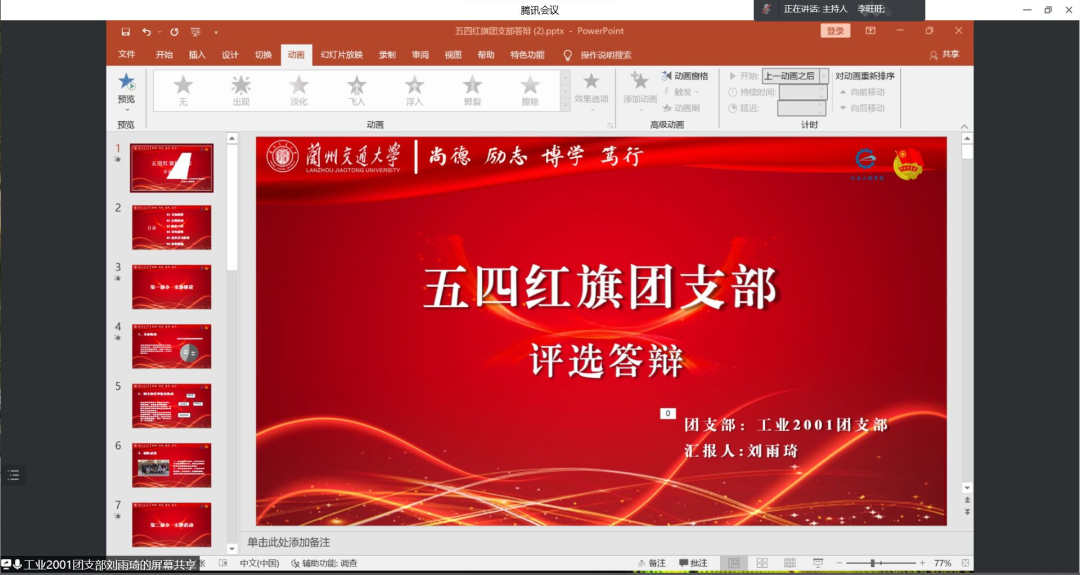 此次评选采取线下团支部组织建设情况考核占比60%,线上“五四红旗团支部”特色亮点工作汇报占比40%的方式进行。参评的23个团支部围绕思想引领、组织建设、学风建设、团学活动、“青年大学习”学习率、成果展示以及对支部未来展望等方面进行了总结汇报,通过生动的语言、详实的数据和丰富的图文资料与大家分享了支部活力与风采,“云”端展现了各团支部团结奋进、踏实进取、朝气蓬勃的精神面貌,展现了广大团员青年的魅力与风采。