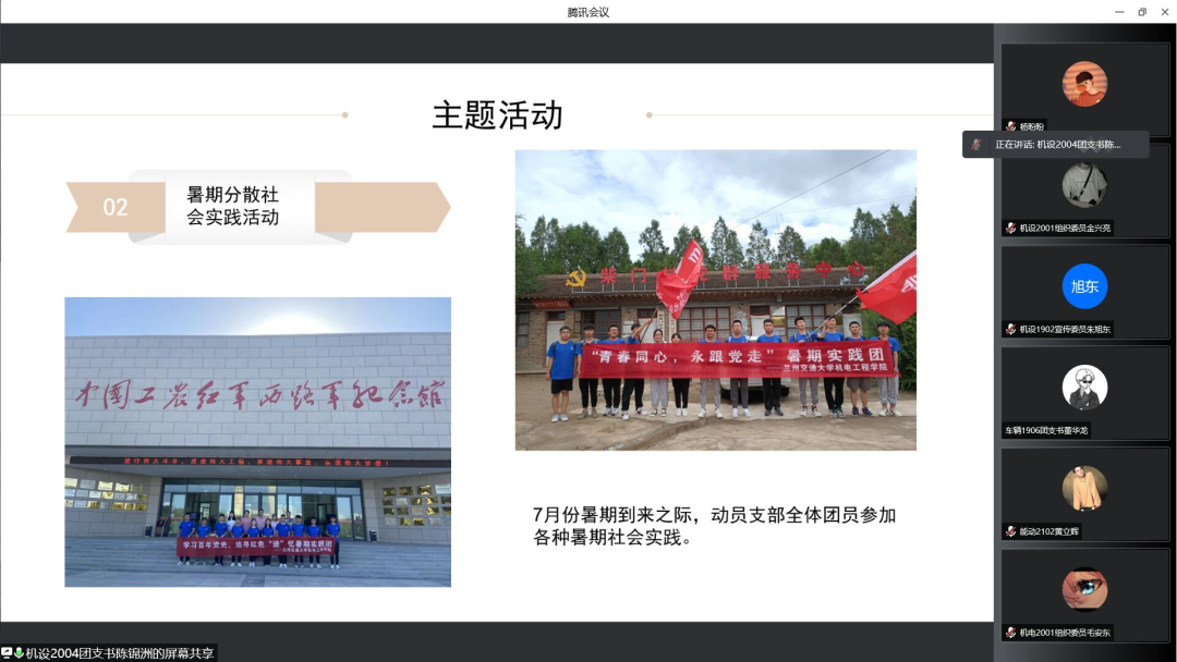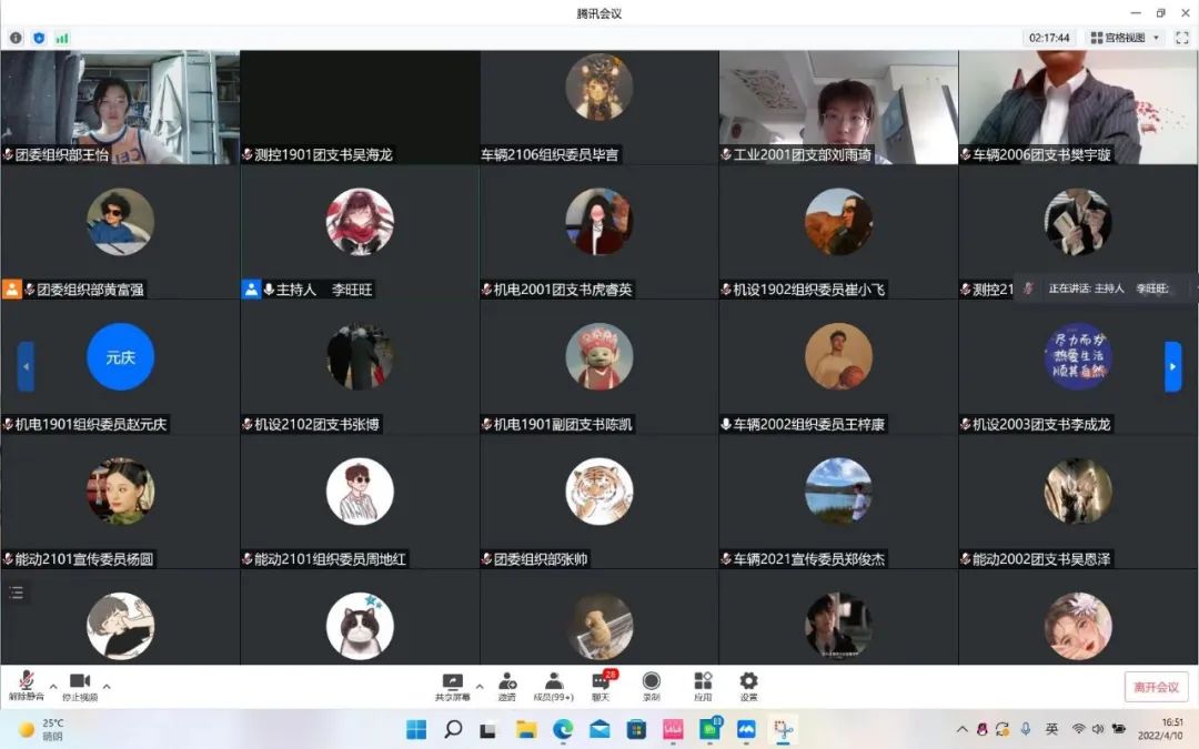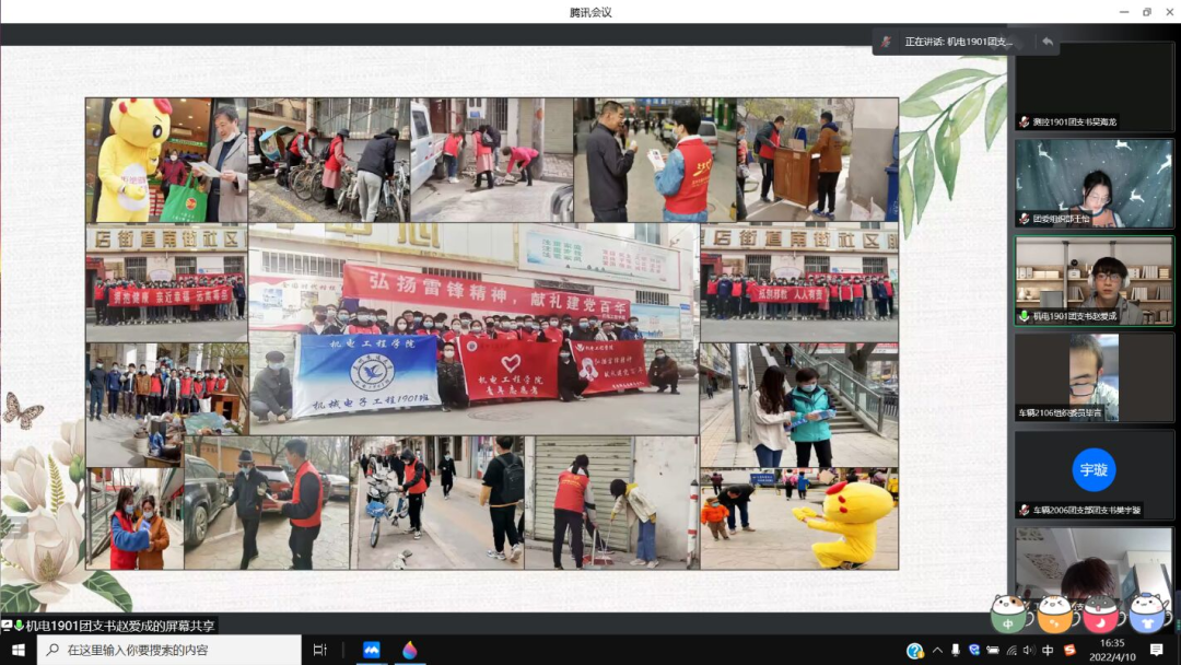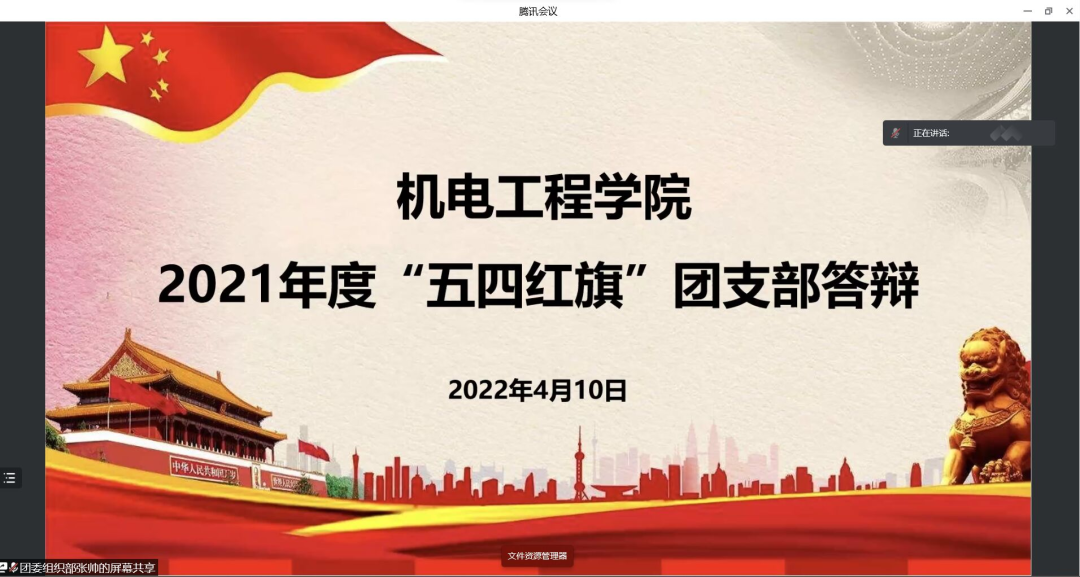 2021年度,机电工程学院各团支部深入学习贯彻党的十九届六中全会、团的十八大精神、积极推进团的各项工作,充分体现着团组织的政治性、先进性、群众性。为大力弘扬“五四”精神,全面总结2021年度团务工作成效,增强团组织的凝聚力和向心力,进一步推动学院共青团工作的开展,同时充分发挥先进典型示范带动作用,团结引领广大团员青年踔厉奋发、砥砺笃行。2022年4月10日15:00,机电工程学院团委线上组织召开2021年度“五四红旗团支部”答辩评选会。学院团委书记胡瑶,团委副书记田正栋同学,团委组织部全体成员,2019级、2020级和2021级各团支部团支书、组织委员和宣传委员共计240余人参加了评选会。