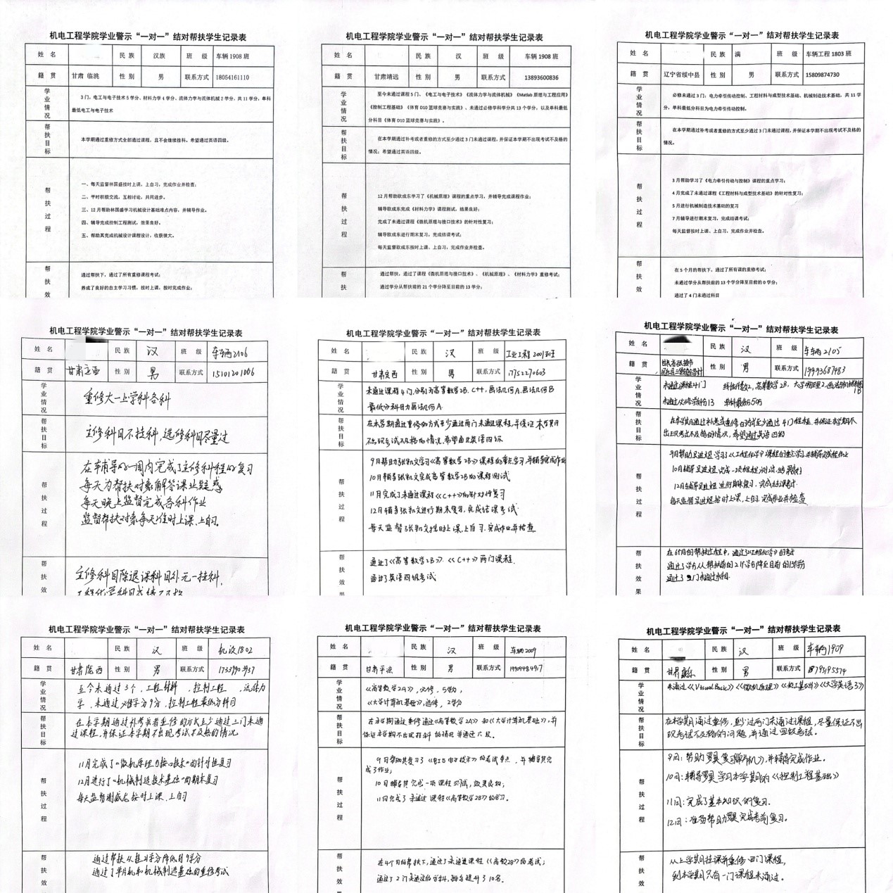 建档立案,反馈评估。建立帮扶对象成长信息库,及时记录、动态更新;定期记录辅导员、班主任、优秀学生开展的结对谈话、课程指导等学生帮扶工作;每学期期末成绩出来后,学院对每个学习困难学生的帮扶成效进行总结分析,根据帮扶对象的学习进步情况提出进一步实施方案。