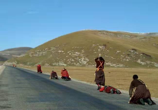 这张图片是半路看见藏族佛教信徒朝拜时所拍,和他们交谈后了解到,他们已走了一个半月了,他们为了自己那份真诚和信仰不远千里朝着自己心目中那份神圣而行走着。虔诚和信仰这两个词是我进入拉萨以后经常看到的和感受到的。在路上,不时地见到信徒们手佩护具,膝着护膝,尘土满面,沿着道路,不惧千难万苦,三步一磕,靠坚强的信念和矢志不渝的精神,一步步趋向圣城拉萨。这就是藏族佛文化的一种体现吧!