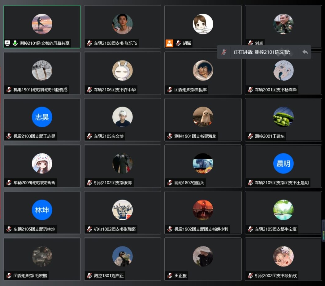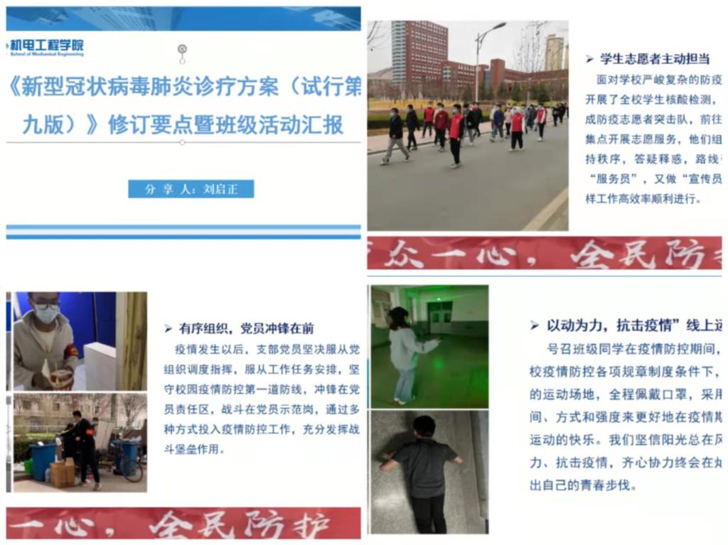 测控1801班团支书刘启正:介绍了《新型冠状病毒肺炎诊疗方案(试行第九版)》修订的五条要点情况。分享了自校园封闭管理以来,班级支部党团员齐心抗疫,党员冲锋在前,团员组成防疫志愿者突击队,前往核酸检测采集点开展志愿服务等事迹;同时对支部线上开展的主题交流会、“抗击疫情”线上打卡运动活动进行了展示;分析了目前班级同学的日常活动和思想动态,表示支部团员一定服从学校各项要求,同全校师生共克时艰,一同迎接“疫后”的艳阳天。