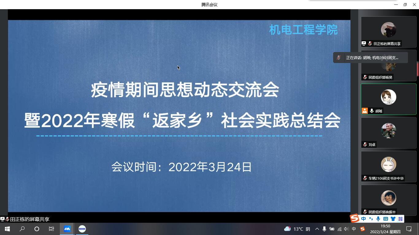 团委书记胡瑶对参与2022年寒假“返家乡”社会实践的学生们的工作给予充分的肯定和表扬,感谢大家在各个岗位的辛勤付出。她指出,“返家乡”社会实践活动是帮助大学生全面发展、成长成才的重要举措,可以让大学生更好地了解家乡、融入家乡、建设家乡,帮助在校大学生熟悉真实工作环境,了解社会实际、服务人民群众、增强时代责任,经受岗位锻炼,明确职业方向,不断提高社会化能力和综合就业能力。她解读了“共青团促进大学生就业行动”的五项具体措施(一般院校低收入家庭学生就业帮扶计划、大学生乡村创业帮扶计划、大学生志愿服务西部计划、大学生实习扬帆计划、大学生社区实践计划)。针对当前疫情防控和学生思想引领工作,她强调,疫情就是命令,防控就是责任。当前疫情形势依然严峻,学校防疫防控正当关键时刻,全体团干部要提高政治站位,带头严格落实疫情防控措施;要强化担当意识,积极参与疫情防控志愿服务;要创新工作模式,组织开展形式多样的云上团学活动;要建立沟通渠道,关注广大同学的身心健康状况。充分发扬“党有号召 团有行动”的优良传统,时刻铭记“请党放心 强国有我”的青春誓言,充分发挥共青团组织在疫情防控中的生力军和突击队作用。同时,她就近期一支部一项目中存在的问题、3月份支部委员会、第一季度支部大会、智慧团建系统第一季度组织化学习录入等工作做了安排部署。
