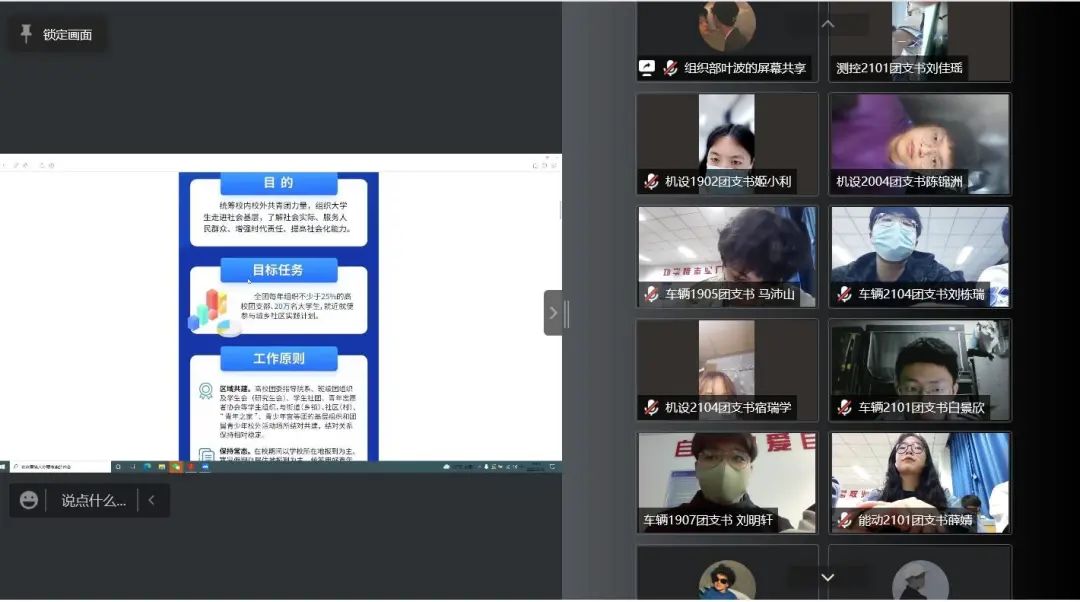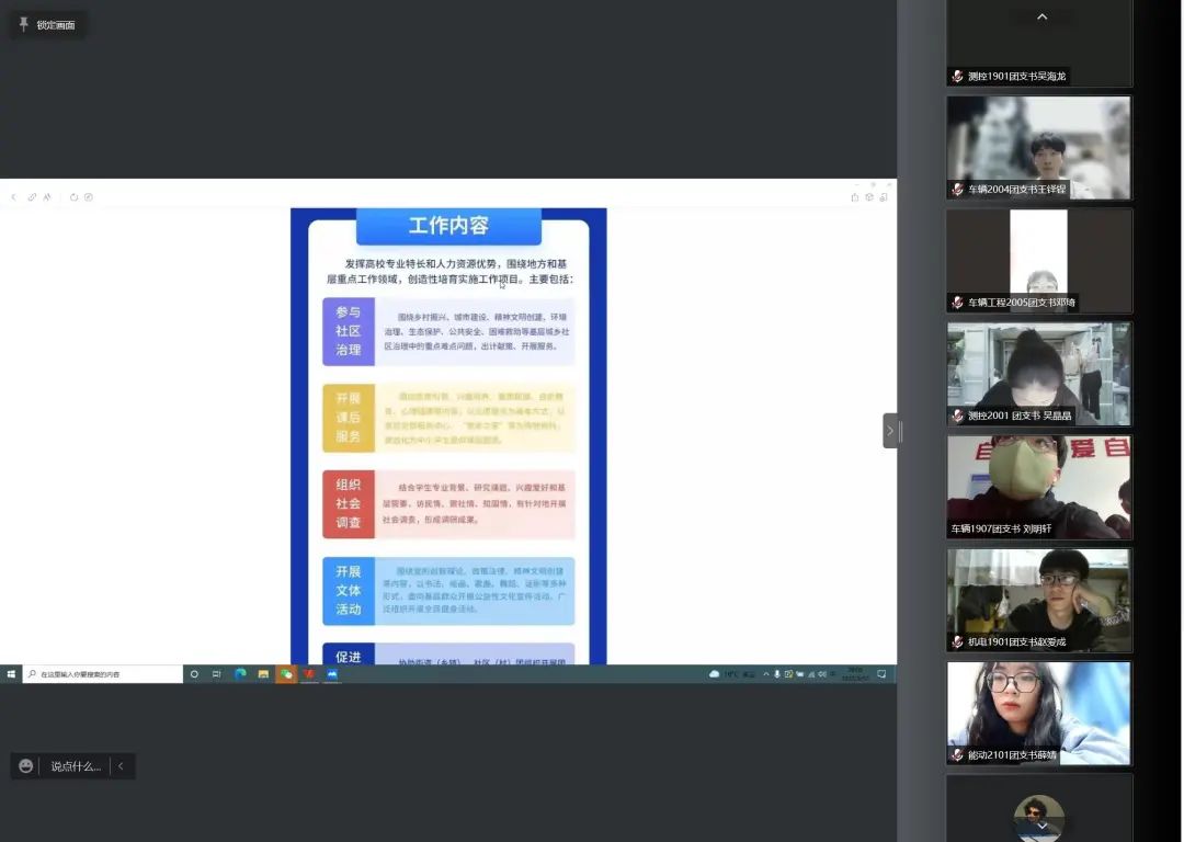 为进一步提升基层团支部的战斗力和凝聚力,加强基层团组织队伍建设,增强团支书的工作能力和服务意识,把共青团干部培养成政治立场坚定、工作能力突出、有创新精神的优秀骨干,2022年3月10日20:00,机电工程学院团委通过腾讯会议召开了线上团支书工作会议暨共青团促进大学生就业行动工作解读会,学院2019级、2020级研究生团支部,2019级、2020级、2021级本科生团支部全体团支书参加了会议。会议由学院团委书记胡瑶主持。