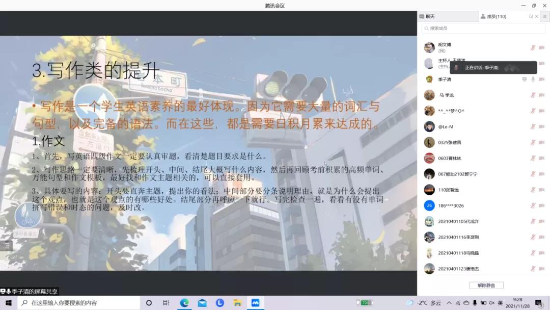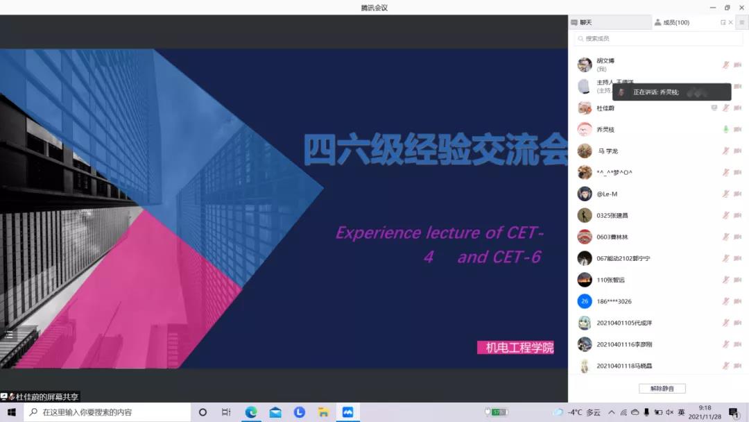 为营造我院浓厚的学习氛围,引导积极向上的学风,加深学生对英语四六级考试的了解,更有针对性地投入到英语学习中,从而提高学习效率,为即将到来的英语四,六级考试做足准备,取得好成绩。2021年11月28日9:00,机电工程学院团委新风文学社通过腾讯会议举办了英语四六级考试经验交流会,400多名同学参加了会议。
