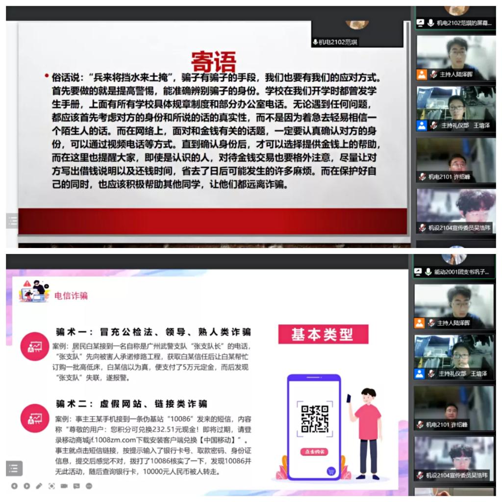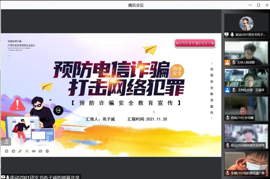 会上,相关负责人通过腾讯会议屏幕共享的方式生动详细地讲解了科普防范知识,班级防诈骗宣传负责人结合实际案例分享了防诈骗经验,旨在希望能够减少诈骗案件的发生,不给犯罪分子可乘之机。预防和控制诈骗犯罪,最关键的是需要提升自我防范意识和能力,即重在自我防范。