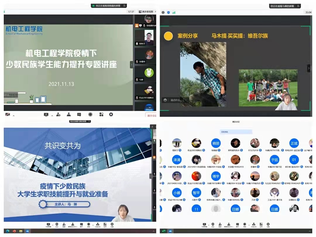 为了进一步加强与少数民族学生的沟通和交流,帮助少数民族学生成长成才,近日,学院通过腾讯会议网络平台举行了少数民族学生成长分享会和能力提升专题讲座,学院党委副书记、副院长荀新文,学工办主任张晓丽、少数民族学生参加了会议。
