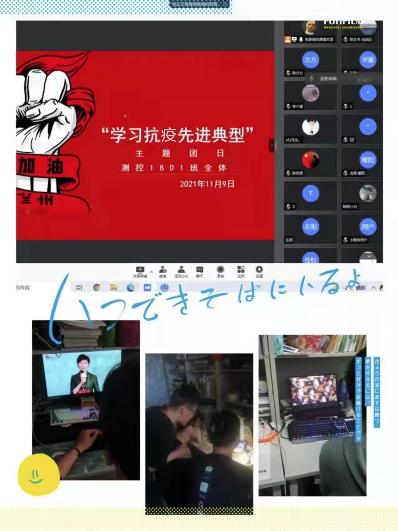 测控技术与仪器1901班于2021年11月9日在线上举办“学习抗议先进典型”主题活动。此次会议的主要内容包括:学习“疫情防控 巾帼不让须眉----兰州市科技局二级调研员吴海芸抗议先进事迹”,“一腔热血报国心----兰州市委直属机关工委马渭平同志抗疫先进事迹”;学习甘肃青年公众号和兰州日报公众号中疫情近况以及抗疫一线的先进事迹;鼓励同学们在疫情期间,努力用好这段时间,克服困难上好网课,多读一些书籍;在寝室保持良好的生活习惯,创建良好的舍友情谊,多和家人朋友交流,思考自己的学业和人生目标。通过此次活动,增强了各位同学打赢“战疫”的信心。