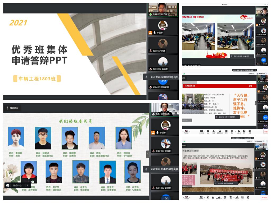 此次申报参评的班级共18个,各班级以PPT的方式展示了一年来在班级制度、学习科研、党团活动、思想建设、文体活动、荣誉成绩、创新做法等方面的成果,他们的每一页PPT充分展示了班级成员们的奋进与努力。经过两个半小时的答辩和前期的综合评价,最终能动1801班、车辆1903班、机设1904班、车辆2001班、机设2002班获得优秀优秀班集体称号。