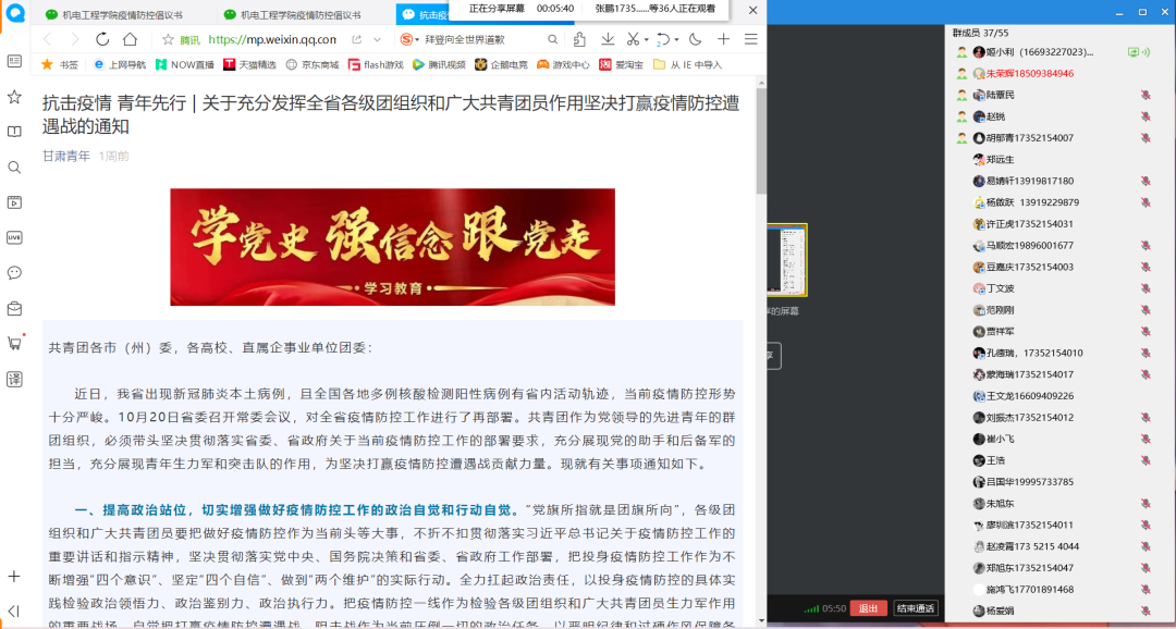 疫情发生以来,机电学子用自己独特的方式诠释着抗“疫”进行时。疫情期间,为了鼓励同学们努力用好这段时间,克服困难上好网课,保持良好的生活习惯,创建良好的舍友情谊,思考自己的人生目标,2021年11月3日,学院召开“同心战疫,我们一定能赢”线上主题团日活动,主要内容包括领学“甘肃省教育厅告全省高校学生书”,贯彻学习“学校关于疫情防控工作部署要求及机电工程学院疫情防控倡议书精神”。