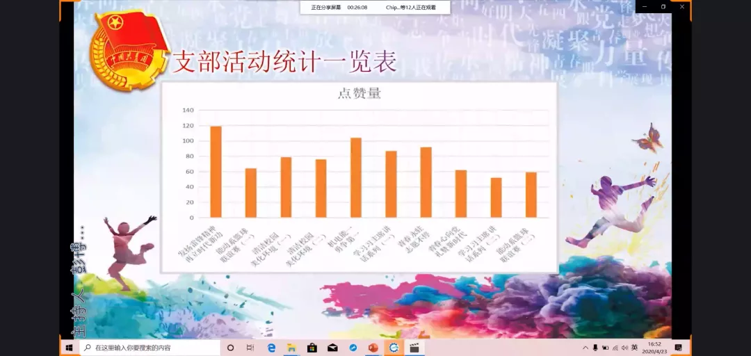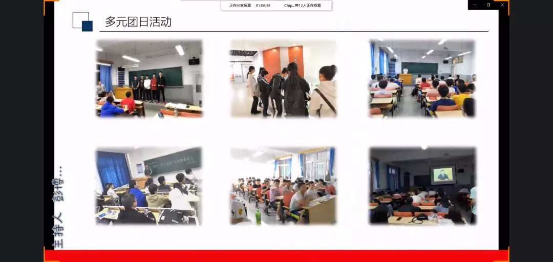 各个团支部积极准备,别出心裁,他们精心设计的PPT充分展现各个团支部团结、积极、向上的风采。从支部的建成时间、组成成分、成员分工等介绍,充分体现了基层团支部的完整性。各支部思想建设尤为突出,对十九大精神、习近平知青岁月的学习体现了同学们对国家政治的关心。各支部团建活动丰富多彩都为大家津津乐道。在学习方面,团支部建立了学习小组互帮互助,使班级的凝聚力得到了深刻的体现。生活方面,各个同学积极参与、互相配合、团结一心,获得了各类奖项,充分体现了团结的重要性。同学在演讲中图文并茂、生动形象,充分展现出了每个团支部的青春风采,同时也表达了未来工作的信心及展望。