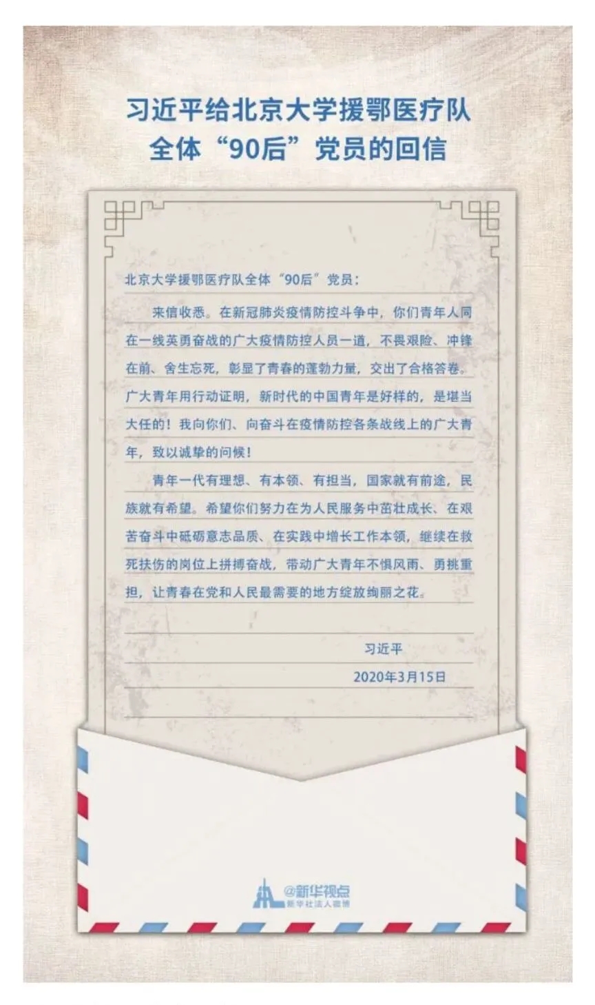 2020年3月15日,习近平总书记给北京大学援鄂医疗队全体“90后”党员回信,向他们和奋斗在疫情防控各条战线上的广大青年致以诚挚的问候,表达了对奋斗在疫情防控一线的广大青年医护人员的关心与肯定,同时也鼓励更多的新时代新青年们不畏艰难、勇挑重担,让青春在党和人民最需要的地方绽放绚丽之花。