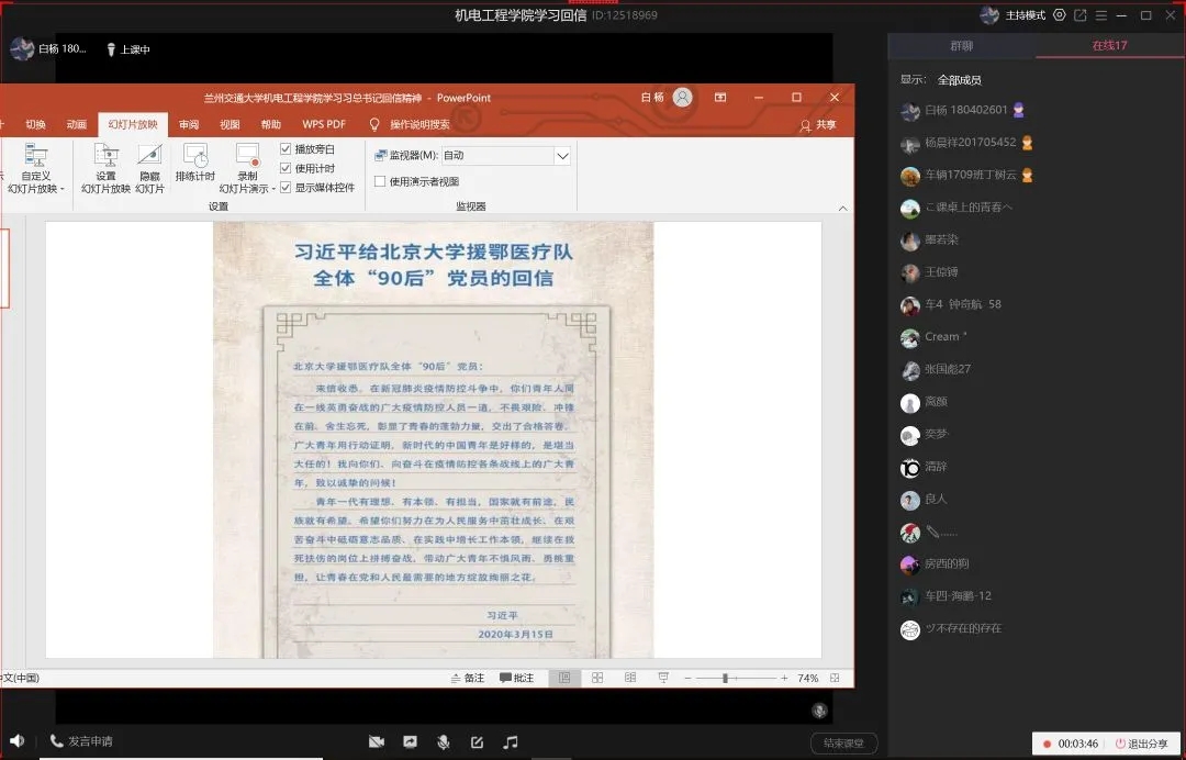 在习总书记饱含深情的回信中,对新时代的中国青年给予充分肯定,令我深受鼓舞。在此新型肺炎疫情肆虐之际,不管是在武汉一线战场上的90后,00后青年医务工作者,还是在全国各地积极投身疫情防控工作的广大青年学子,都用自己的行动向全国人民展现了青年一代的担当。在此特殊时期,作为青年团员的一员,我们应当坚决响应国家号召,服从学校各项安排,努力适应网上教学新方式,按时出色的完成学业任务,不辜负习总书记对我们青年一代给予的厚望。同时,我也坚信疫情终散去,春暖花自开!