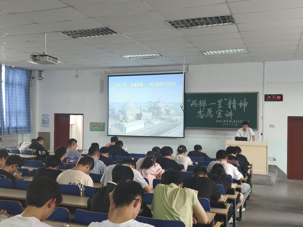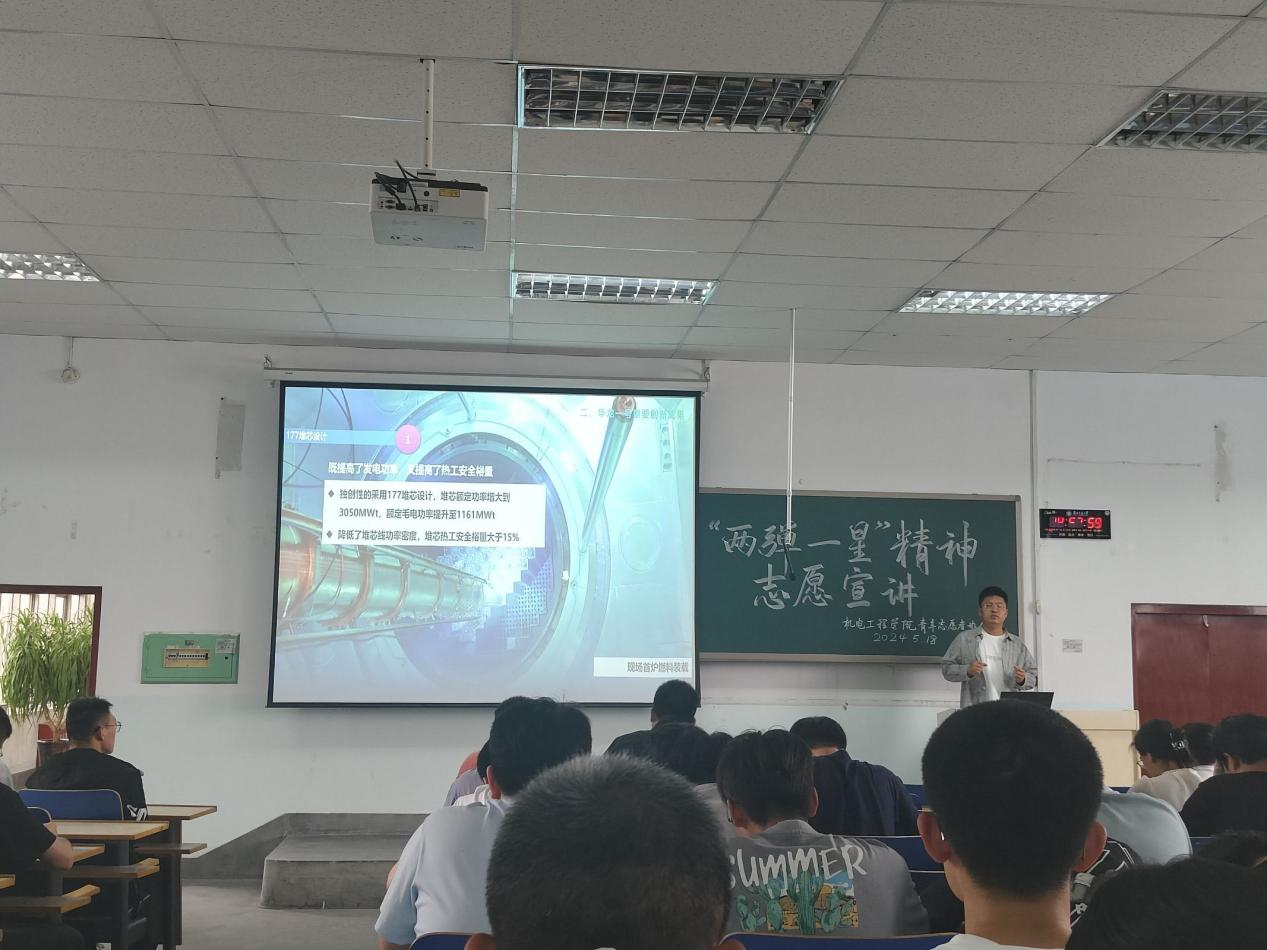 将科学故事带到教室,将科学精神讲到心里。整个宣讲活动深刻地回顾了中国核工业的辉煌历程,同时也表达了对那些为国家核事业作出卓越贡献的科研工作者们的崇高敬意,正是这些科研人员以他们的智慧、勇气和牺牲精神,铸就了国家核工业的辉煌成就。宣讲过程中讲述的每一个故事,都深深触动着在场青年们的心灵,激发了他们对科学探索的热情和对国家未来的憧憬。通过宣讲,激发了青年学生对科学的热爱,引导大家将“两弹一星”精神内化于心、外化于行,主动肩负起历史重任,树立远大志向,把自己的科学追求融入到建设社会主义现代化国家的伟大事业中去。