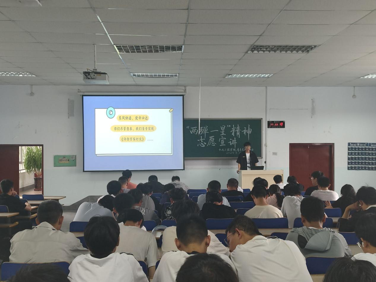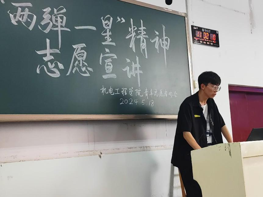 为深入传播和弘扬“两弹一星”精神,激发广大青年的爱国热情,引导青年深刻理解并践行热爱祖国、无私奉献,自力更生、艰苦奋斗,大力协同、勇于攀登的精神,激励青年以实际行动为实现中华民族的伟大复兴和国家的繁荣富强贡献青春力量,5月18日下午,机电工程学院青年志愿者协会于第七教学楼开展了“两弹一星”精神志愿宣讲。青年志愿者刘嘉斌、侯栋和王智三人担任了主讲。