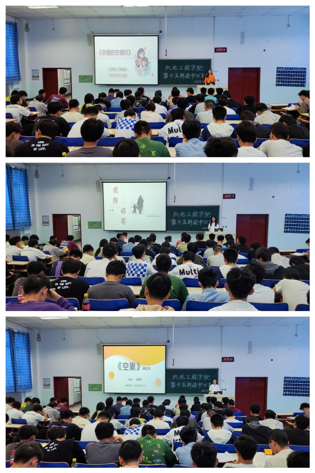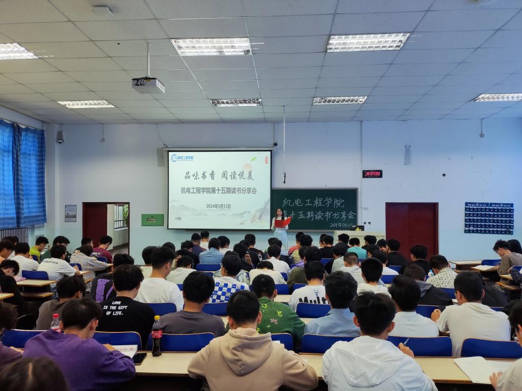 为加强学院学风建设,进一步激发机电学子的阅读热情,丰富校园文化生活,营造浓厚的阅读氛围,提升学生的阅读水平和文化素养,引导学生格物致知、修身正己,5月12日上午,机电工程学院在第七教学楼1801教室举行了以“品味书香,阅读悦美”为主题的第三届第十五期读书分享会,2023级180余名学生参加,分享会由李悦同学主持。