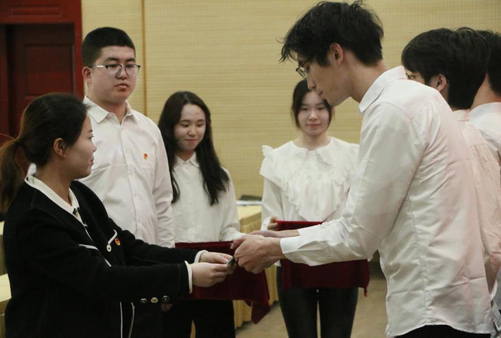 主持人刘嘉斌宣读了2023-2024学年春季学期新发展团员名单,宣布经团组织培养考察推荐,共有137名青年光荣地加入了中国共产主义青年团。辅导员孟玲老师为新团员代表颁发了团员证和团徽,熠熠团徽佩戴在新发展团员的胸口,意味着从此时此刻开始,他们将正式成为一名光荣的中国共产主义青年团团员,既彰显了共青团员称号的荣光,又体现了共青团员的责任与担当,激励着新发展团员时刻牢记团员身份,朝着党组织指引的方向奋勇前进,永远忠于祖国、忠于人民,永远朝气蓬勃、奋发向上,永远发挥好共青团员的先锋模范作用。