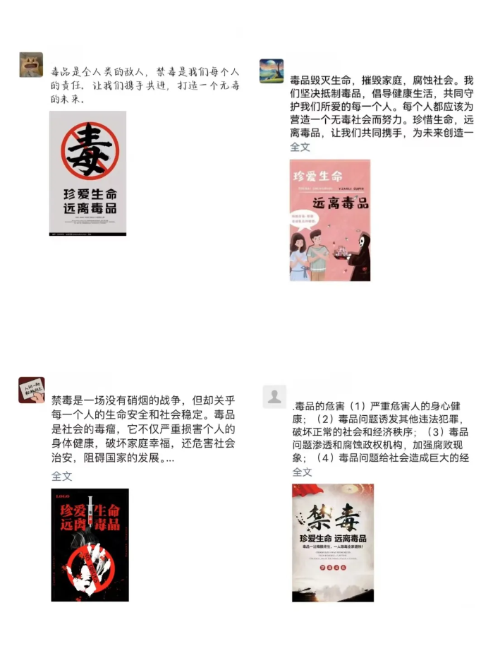 青年志愿们于图书馆前鸽子广场宣讲毒品的危害、毒品的类型以及禁毒的目的及意义等,并以宣传图片和文案的形式在朋友圈中发布禁毒知识资料,引导同学及亲属们从自身做起、从点滴做起,自觉成为拒毒防毒的参与者、践行者、推动者。参与的同学表示通过活动了解到了毒品的危害,掌握了防毒的基本技巧,明白了参与禁毒斗争的重要性、必要性和紧迫性。此次活动,通过线下宣传和线上宣传相结合的形式,扩大了禁毒宣传的覆盖面,拓展了大家对毒品的认知与理解,进一步提高了禁毒防毒意识,引导公众树立正确的人生观、价值观和健康观,树牢“珍爱生命,远离毒品”和“健康人生、绿色无毒”的理念。