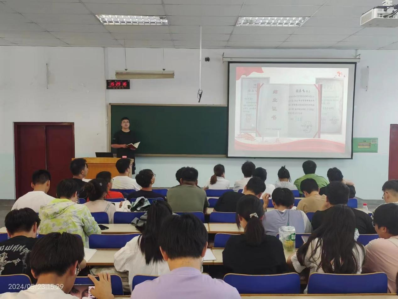为学习贯彻习近平新时代中国特色社会主义思想,深入落实习近平总书记关于青年工作的重要思想,扎实推动机电工程学院“青马工程”实施方案有效落实,依托本年度“青马工程”培训班的朋辈经验研讨环节,机电工程学院团委于5月23日15:30在第七教学楼1802教室开展了“榜样引领,筑梦未来”朋辈分享交流会,充分发挥“青马”学员榜样的示范引领作用,加强学生骨干的思想引领,构建相互交流、展现自我、互学互鉴、互促共进的平台。本次交流会邀请到省级“青马工程”学员、机电工程学院团委主席团成员张乐飞同学做经验分享,辅导员孟玲老师和学院2023-2024学年全体“青马工程”学员聆听了分享。