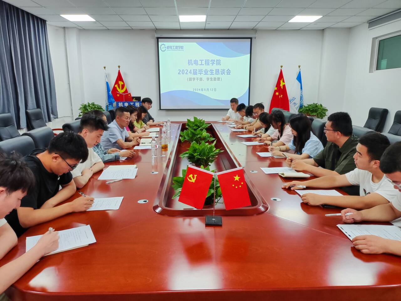 为了不断优化提升学院教育教学和学生管理服务工作,6月12日,机电工程学院在笃行楼B座607、707会议室召开了“青春逐梦,思恩行远”为主题的2024届毕业生恳谈会,学院党委副书记、副院长荀新文,副院长朱喜锋,教务办公室主任董海棠,学生工作办公室主任张晓丽,辅导员孟玲,教务办工作人员陈丽萍、陈龙以及毕业班学生代表参加了座谈会。