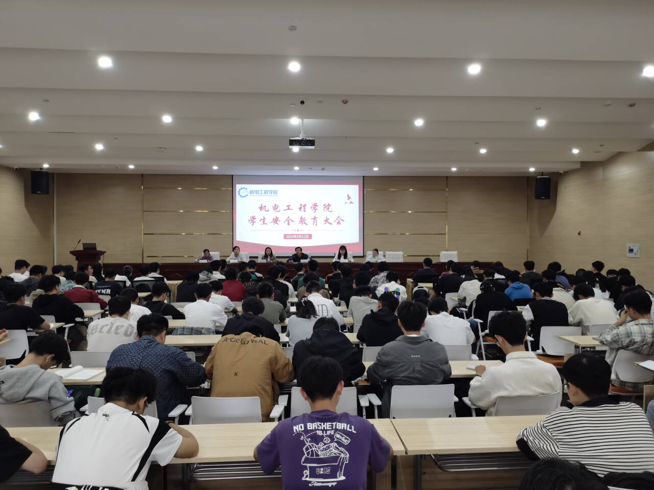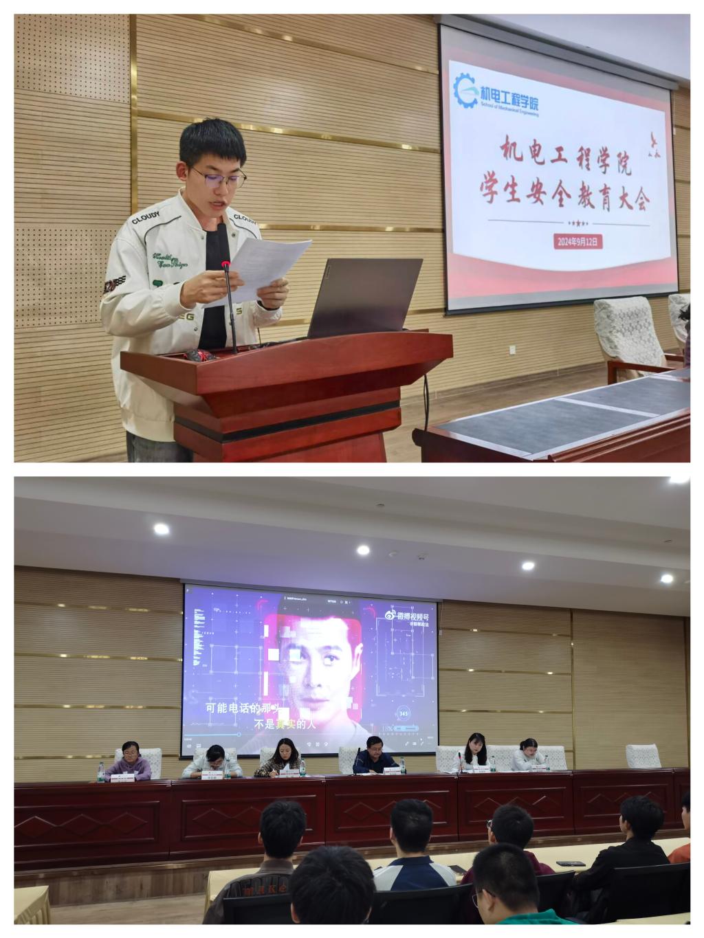 学生工作办公室主任张晓丽宣读了《机电工程学院大学生安全宣传教育月活动实施方案》、《机电工程学院信息反馈具体要求,从活动主题、活动时间、活动内容、活动要求等方面进行了详细的安排部署。会上,组织观看了大学生安全教育宣传片;学生代表袁吉润宣读了《机电工程学院大学生安全宣传教育倡议书》,从遵守规章制度,增强安全意识;夯实安全基础,筑牢安全防线;维护校园秩序,巩固安定团结;恪守学术道德,营造优良学风;规范行为习惯,保持身心健康;维护网络文明,展现青春风采等六个方面对全院学生提出了要求,号召大家立即行动起来,从自己做起、从现在做起、从身边小事做起,争做安全文明建设的践行者、宣传者和监督者。