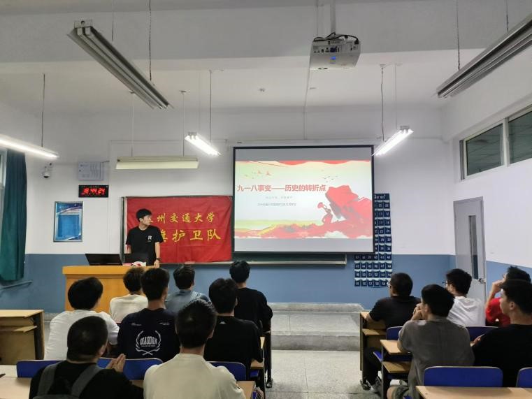 为纪念“九一八”事变93周年,引导青年学子牢记历史、勿忘国耻,弘扬爱国热情,传承革命精神,缅怀革命英烈,9月18日,兰州交通大学国旗护卫队于五教109教室召开了“铭记九一八,勿忘国耻”主题学习活动。在团支书王振宏的带领下,国旗护卫队所有队员共同回顾历史,铭记那个刻骨铭心的日子——“九一八”。