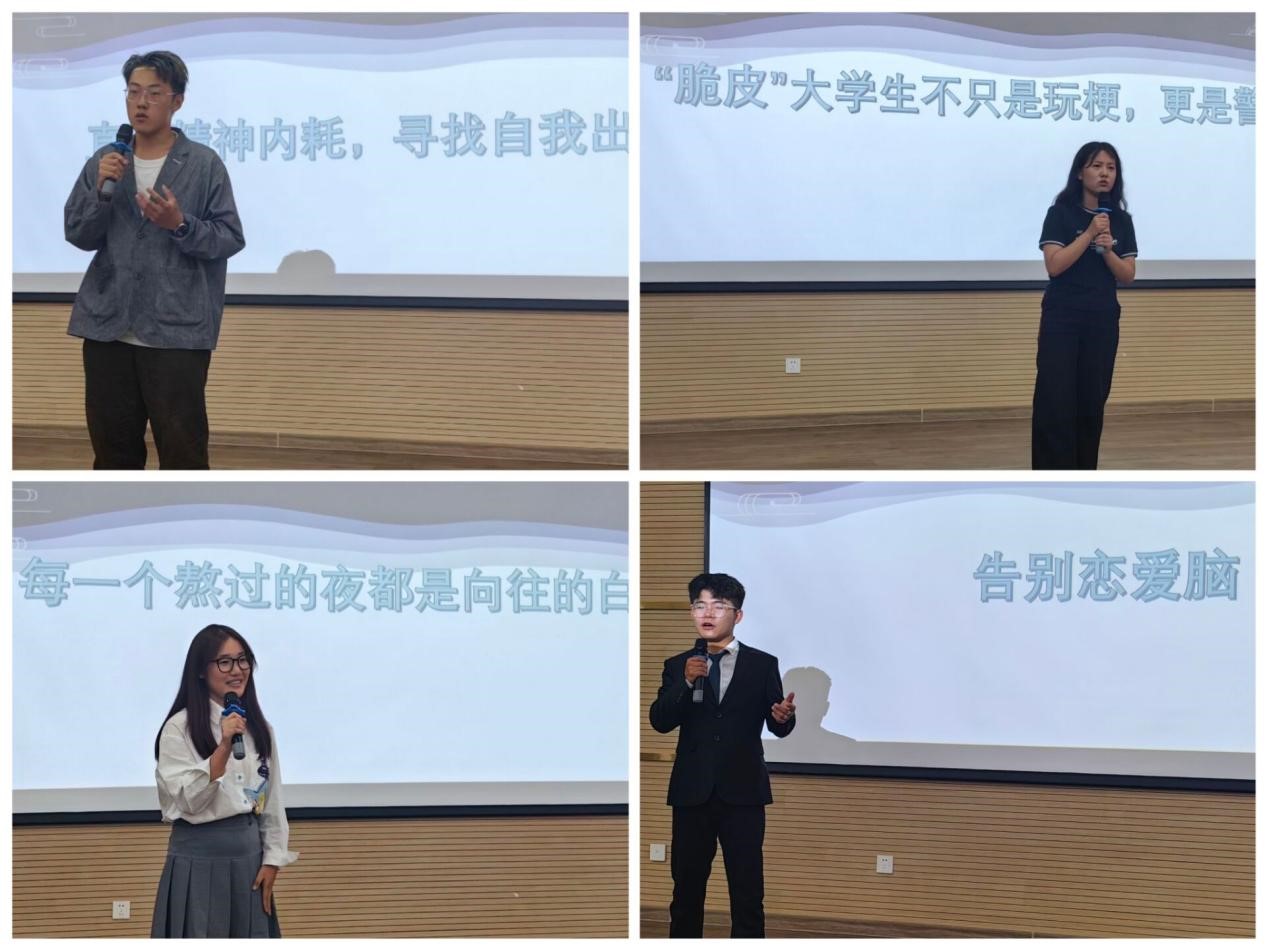 在即兴演讲环节中,选手们通过现场抽签、即兴演讲的方式,考验了他们的语言组织能力,也锻炼了他们的应变能力和自信心。选手们围绕“直面精神内耗,寻找自我出口”、“每一个熬过的夜都是向往的明天”、“告别恋爱脑”等网络上的热点、时政新闻,结合所思所悟、结合自身实际,在短时间内构思并组织语言,以清晰、流畅的方式表达自己的观点,展现了青年敢于担当、勇于奉献、昂扬向上的青春风采。