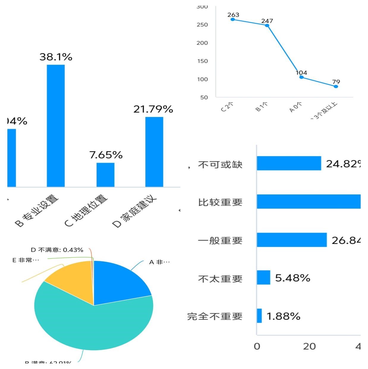 学生会工作人员对问卷调查的数据进行了详细分析,调查结果表明,在学校及专业选择方面,专业吸引占比最高,占总票数的38%,家庭建议占21%,学校声誉占18%,地理位置占7%。