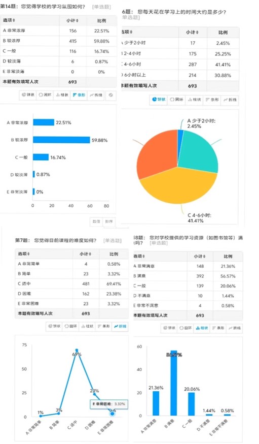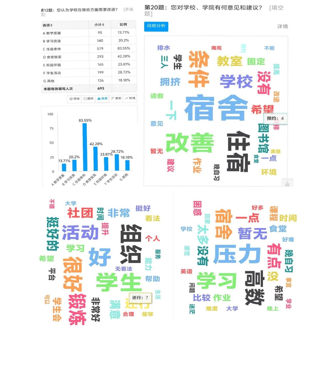 本次调研通过调查问卷填写方式开展。问卷调查围绕宿舍问题、食堂问题、校园文化、学校教室、校园问题以及其他方面这五个板块设置了20小题。大一新生积极参与,问卷内容浏览量超过1000余次,共收集到有效问卷达693份。