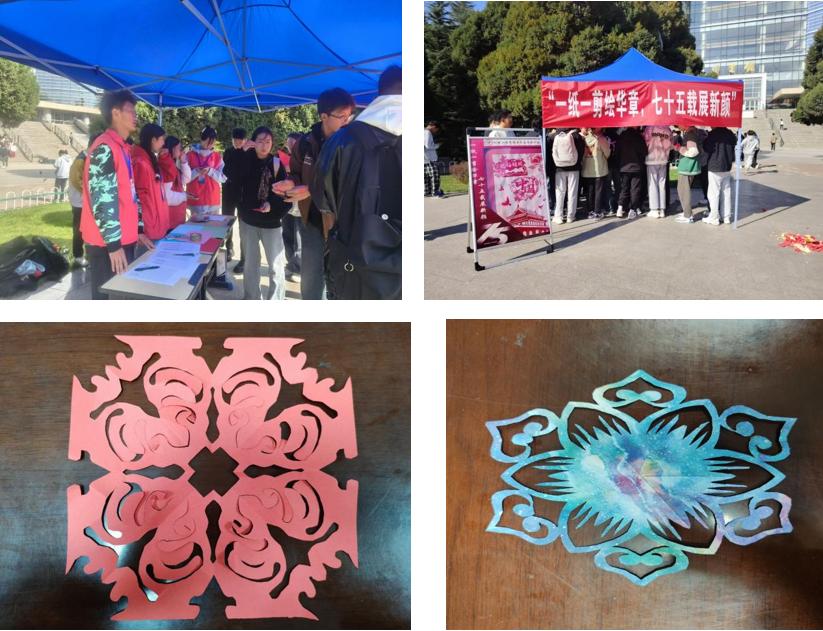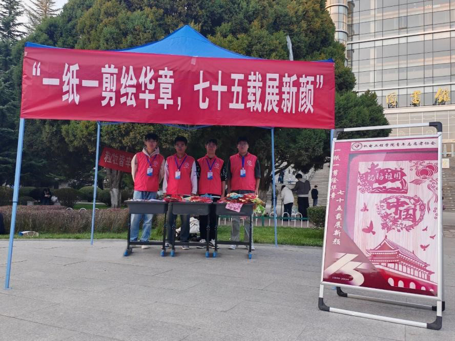 为庆祝中华人民共和国成立75周年,深入学习贯彻习近平文化思想,弘扬中华民族优秀传统文化,增强民族自豪感和爱国热情,丰富校园文化生活,2024年10月17日,学院青年志愿者协会开展了“一剪一纸绘华章,七十五载展新颜”剪纸活动。